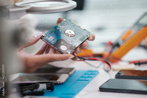Hard drive in hands of repairing service worker