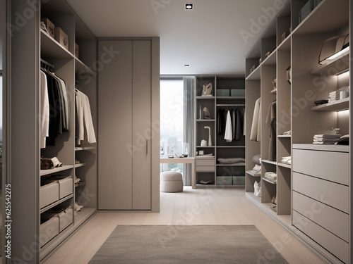 Contemporary interior design for a grey walk-in wardrobe. Generative AI