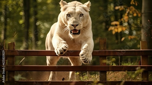 a lioness jumps over a fence, much forest, brandenburg, berlin