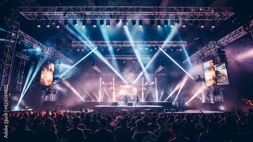 A theatrical production performed on a live stage in a venue. Stage rigging equipment, lighting, and PA systems are utilized for the show.