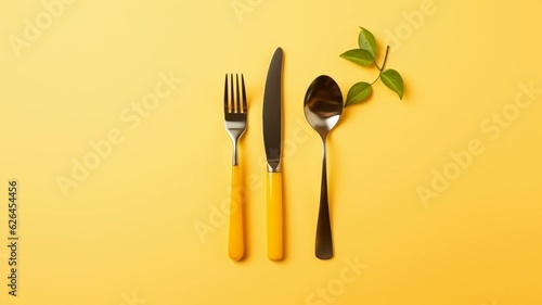 fork, spoon and knife, yellow cutlery flat lay