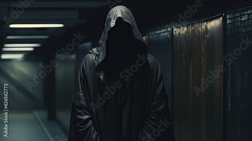Hooded Figure in Empty Subway Station. Dangerous . Black Clothing. Concept of Moody, Scary, Ominous, and Dark Entity. Grim Reaper Like. Portrait Close Up.