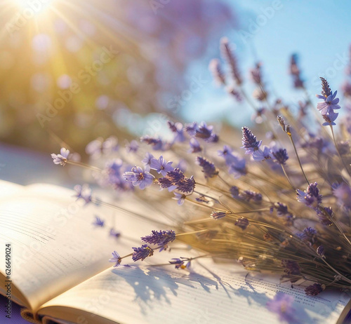 Purple field flowers on an open book. The poetic and romantic atmosphere on a summer day with beautiful sun.