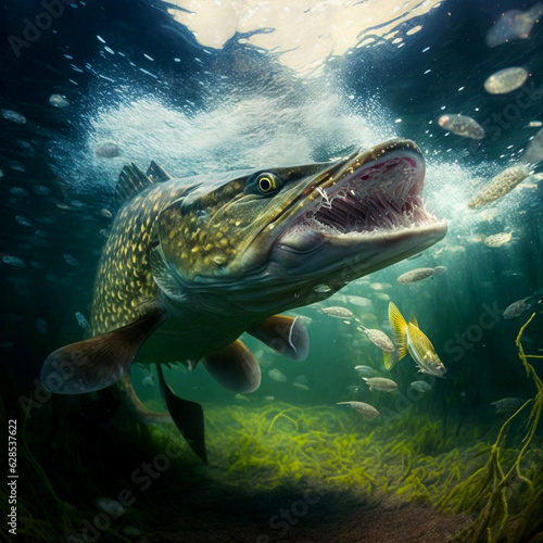 Large pike with big teeth, predatory Fish, fishing hobby, clean river.