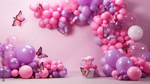 decoração de festa com fundo de fotografia de borboleta fofa com arco de balão