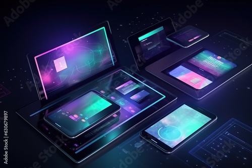 Technological image of devices with purple and blue screen and black background