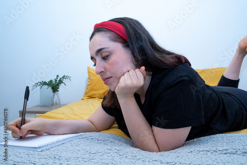 Aprendiendo y comunicando: Instantánea de una mujer dedicada estudiando y redactando una carta personal en su libreta desde la cama