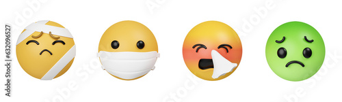 Emoji sick vector set. Emojis tired, ill, silent and irritated icon collection. icon isolated on gray background. 3d rendering illustration. Clipping path.