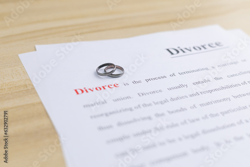 Close-up two wedding rings above decree document. Divorce and separation concept. Family break up or divorce, conflict concept. terminating a marriage or marital union. Divorce laws.