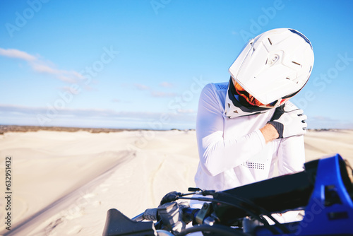 Stretching, shoulder pain and person on motorbike with a strain or injury in desert ready for extreme sports. Performance, training and hurt rider in nature for exercise with motorcycle on dirt road