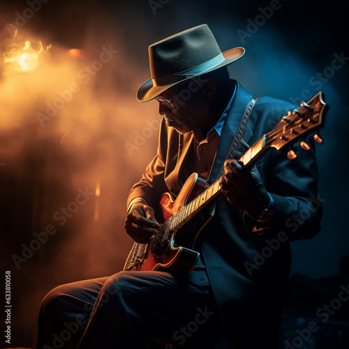 Bluesman play on guitar blues rock under stage light. Festival music concert with songs. Black skin guitarist in hat. Retro style.