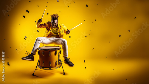 Musiker springt hoch jubelnd mit fliegenden Schlagzeug Hintergrundbewegung witzig als Querformat Banner, ai generativ