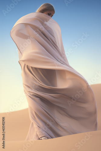 Woman in a long dress walking in the desert with flowing fabric in the wind
