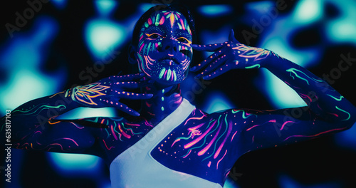 Portrait of a Talented Female Artist Showcasing Graceful Movements and Expressive Emotions with Her Innovative Modern Dance Routine in a Dark Studio with Abstract Art in the Background