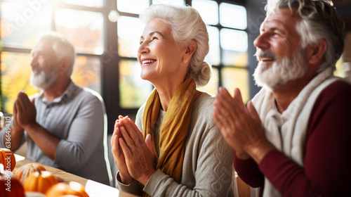 Seniors Engaged in a Heartfelt Thanksgiving Prayer, happy seniors celebrating Thanksgiving, wide banner with copy space area Generative AI