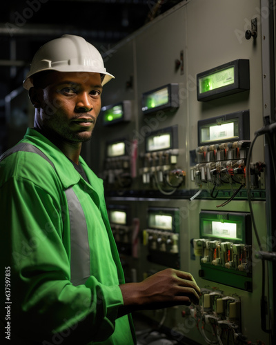 A Water Treatment Operator gazes intensely at a control panel illuminated by the bright hue of green block letters that detail water purity levels. He looks unflinching and prepared ready to take