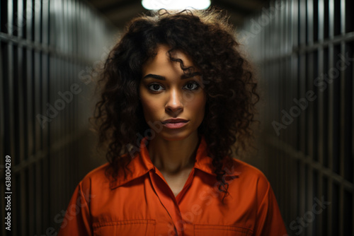 African American prisoner woman in jail, sad female convict in orange robe in detention cell. Crime, arrest concept