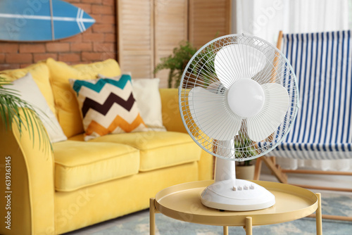 Electric fan on wooden coffee table in interior of stylish living room