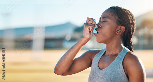 Fitness, breathe and black woman with asthma, inhaler or pump at sports court for training with lung problem. Exercise, deep breath and lady runner with medical relief from allergy respiratory issue
