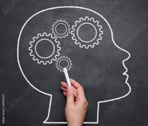 Silhouette of a head and a brain consisting of cogs. Concept of searching for ideas, mental health