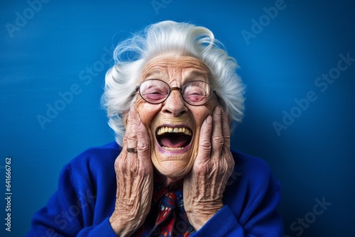 Close-up portrait photography of a joyful old woman placing the hand over the mouth in a laughter gesture against a royal blue background. With generative AI technology