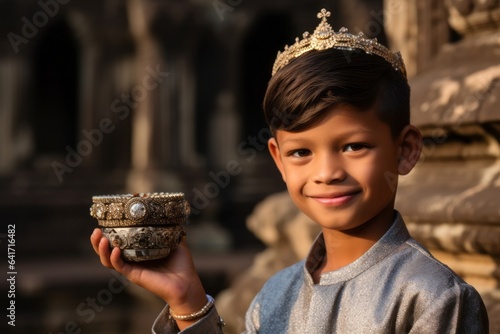 Medium shot portrait photography of a merry boy in his 30s holding a cup of coffee donning a sparkling tiara at the angkor wat in siem reap cambodia. With generative AI technology