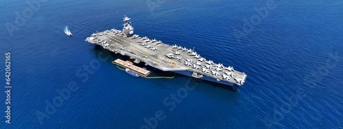 Aerial drone ultra wide panoramic photo with copy space of latest technology nuclear powered aircraft carrier USS Gerald R. Ford anchored in deep blue open ocean sea