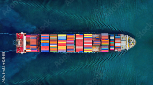 Industrial import-export port prepare to load containers. Aerial top view container ship in export and import global business and logistic. Global transportation and logistic business.
