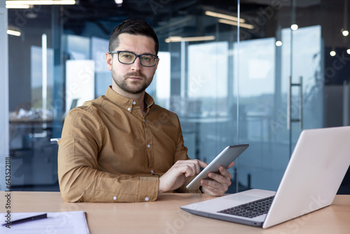 Portrait of a young male office worker sitting at a desk, holding a tablet and looking seriously at the camera