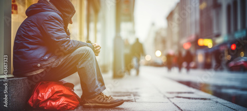 Homeless people on city streets, hungry homeless begging for help and money, Problems of big modern cities