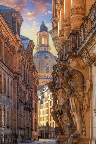 Cityscape - street view with sculptures of gatekeepers on the George Gate of Dresden Castle against the backdrop of the Dresden Frauenkirche, Dresden, Germany