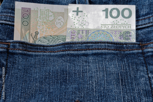 Banknot stuzłotowy w kieszeni jeansów.