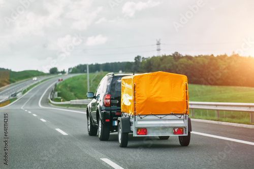 SUV and Rental Cargo Trailer on a Road. Efficient moving.
