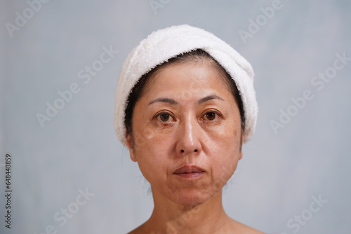 シミ、シワのある老け顔の中年女性 カメラ目線