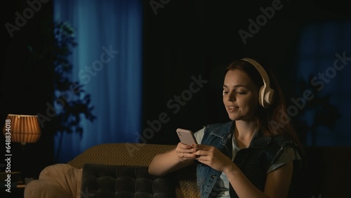 Girl in headphones sitting on the sofa in the dark living room, carefree listening to music on smartphone, smiling face expression.