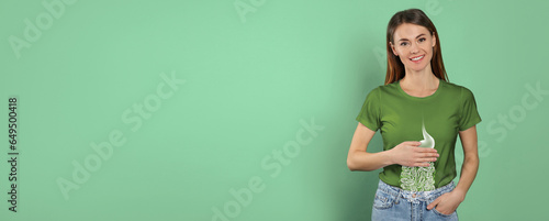Happy woman with healthy digestive system on turquoise background, banner design with space for text. Illustration of gastrointestinal tract