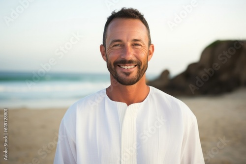 medium shot portrait of a Israeli man in his 40s wearing a simple tunic against a beach background