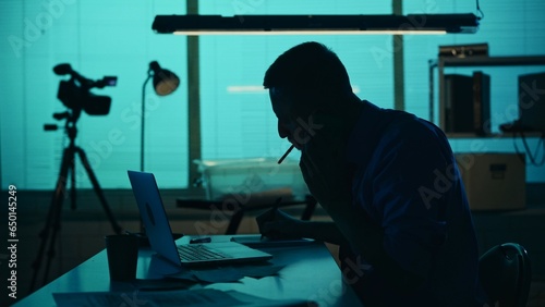 Medium silhouette shot of a detective, policeman sitting in the interrogation room, smoking, working on a laptop and studying the evidence.