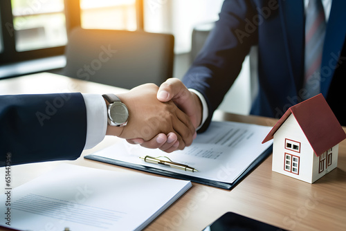 Professional real estate agent shaking hands with client after signing home purchase contract in real estate agency office