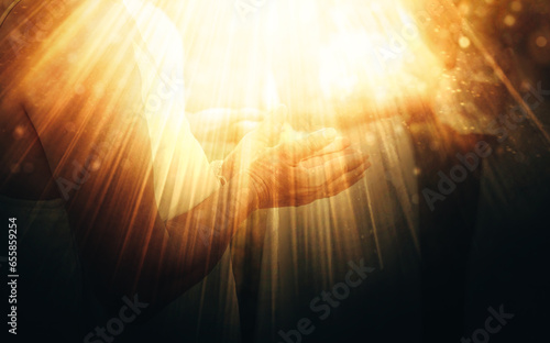woman in a ceremonial space. Close-up shot of a woman's hand during the ceremony. Light effect.