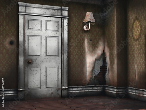 Stary pokój ze zdartą tapetą, lampą retro i drzwiami