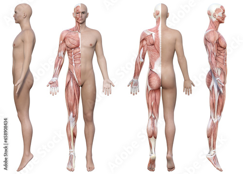 男性の筋肉解剖図と人体モデル4方向セット(正面・側面・背面・3Dイラスト)