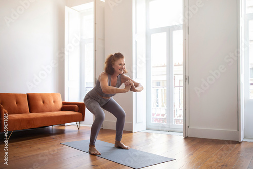 Home Workout. Smiling Senior Woman Doing Squats While Training In Living Room