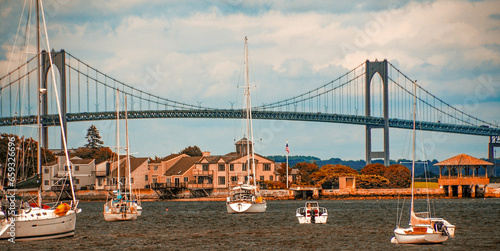 Port of Mystic with boats on a cloudy summer day, Connecticut