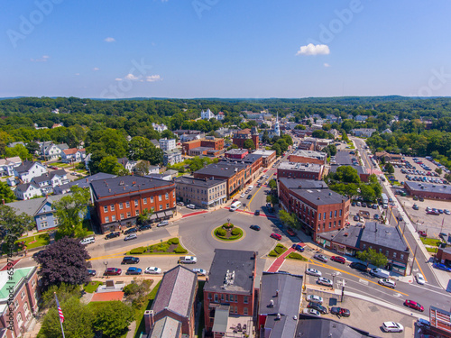 Hudson historic commercial buildings aerial view on Main Street in town center of Hudson, Massachusetts MA, USA.