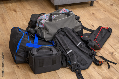 Pakować się na wyjazd, torby j plecaki leżą na podłodze