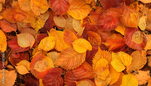Autumn background. texture of colorful fallen foliage of elm tree, abstract natural backdrop. beautiful fall season. top view. full frame. template for design