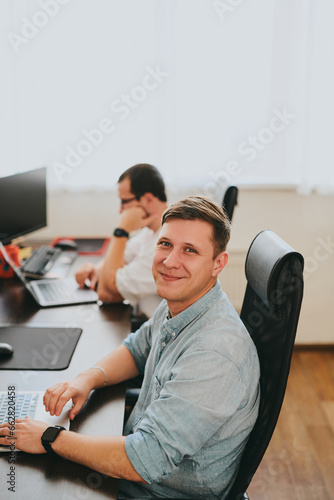 Portrait of two professional male programmers working on computer in diverse offices. Modern IT technologies, development of artificial intelligence, programs, applications and video games concept