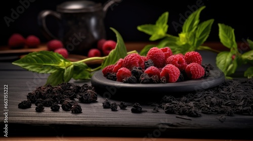 Black dry tea, selected leaves, on the kitchen board. Next, dried raspberries, flavor additive. Preparation of fruit tea, home comfort, hospitality.