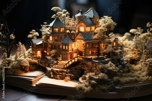 A house with walls made of books, blending the realms of architecture and literature. Concept of literary architecture. Generative Ai.